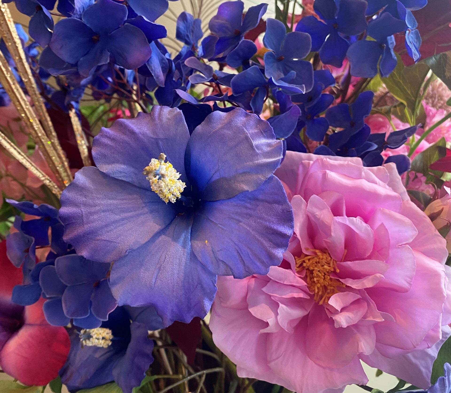 Deze royaal gevulde pot is een eyecatcher waar je niet om heen kunt! De hibiscussen zijn werkelijk zo prachtig dat je zult moeten voelen om er zeker van de te zijn dat deze niet echt zijn.