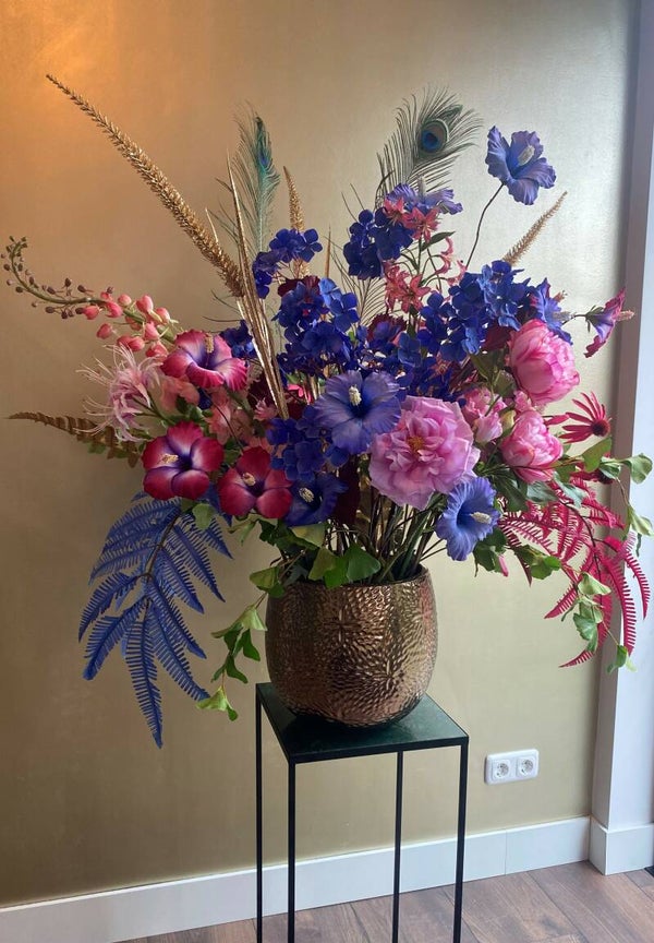 Alle zijden bloemen zijn van de hoogst mogelijke kwaliteit. Een prachtig uniek bloemstuk die vele ogen zal trekken!