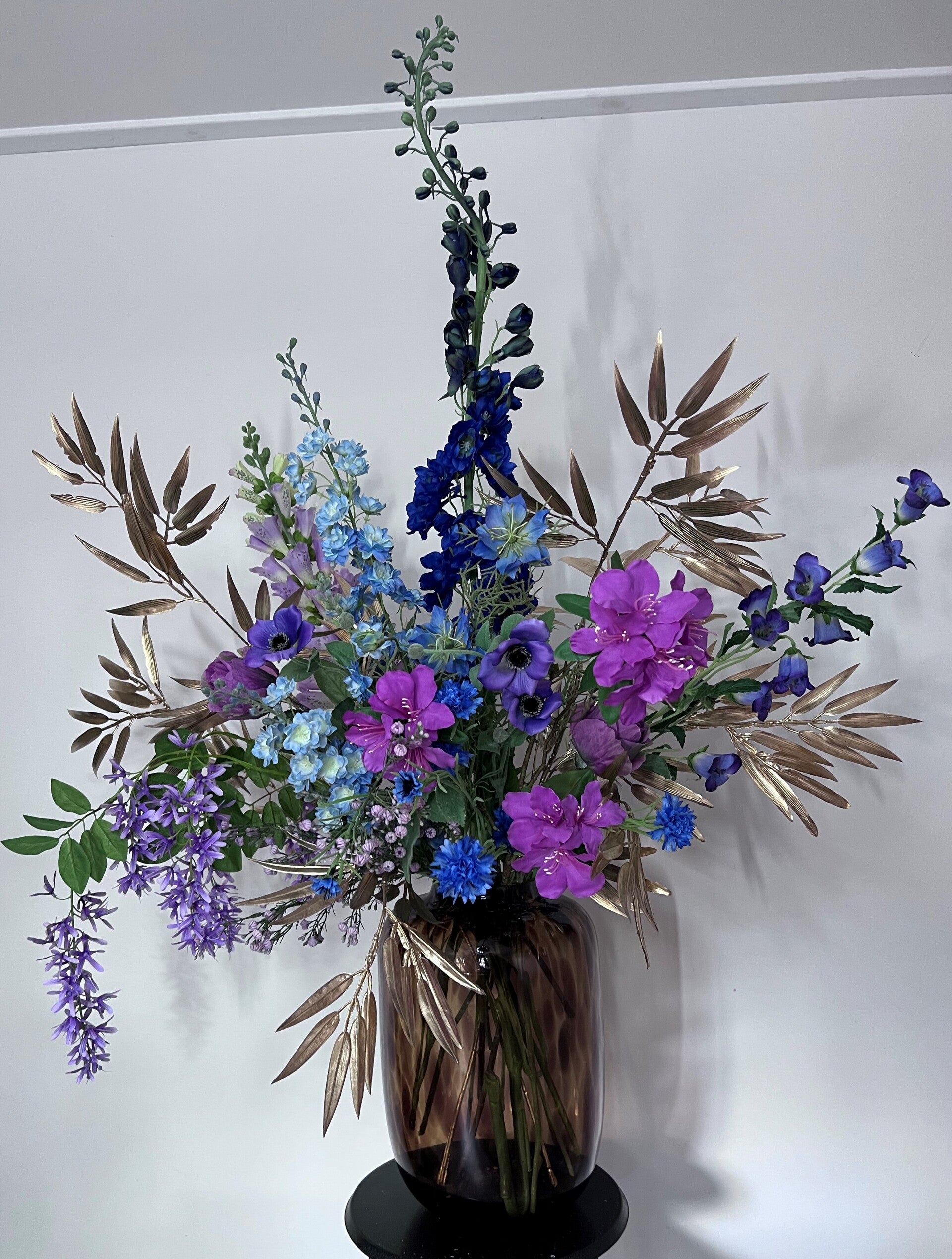 Donkere bloemen die met een gouden touch een fantastisch pronkstuk vormen! Het boeket staat op een grote cheetah vaas van 34 cm cm hoog. Met deze combinatie ben je gegarandeerd van een mooie eyecatcher in huis.